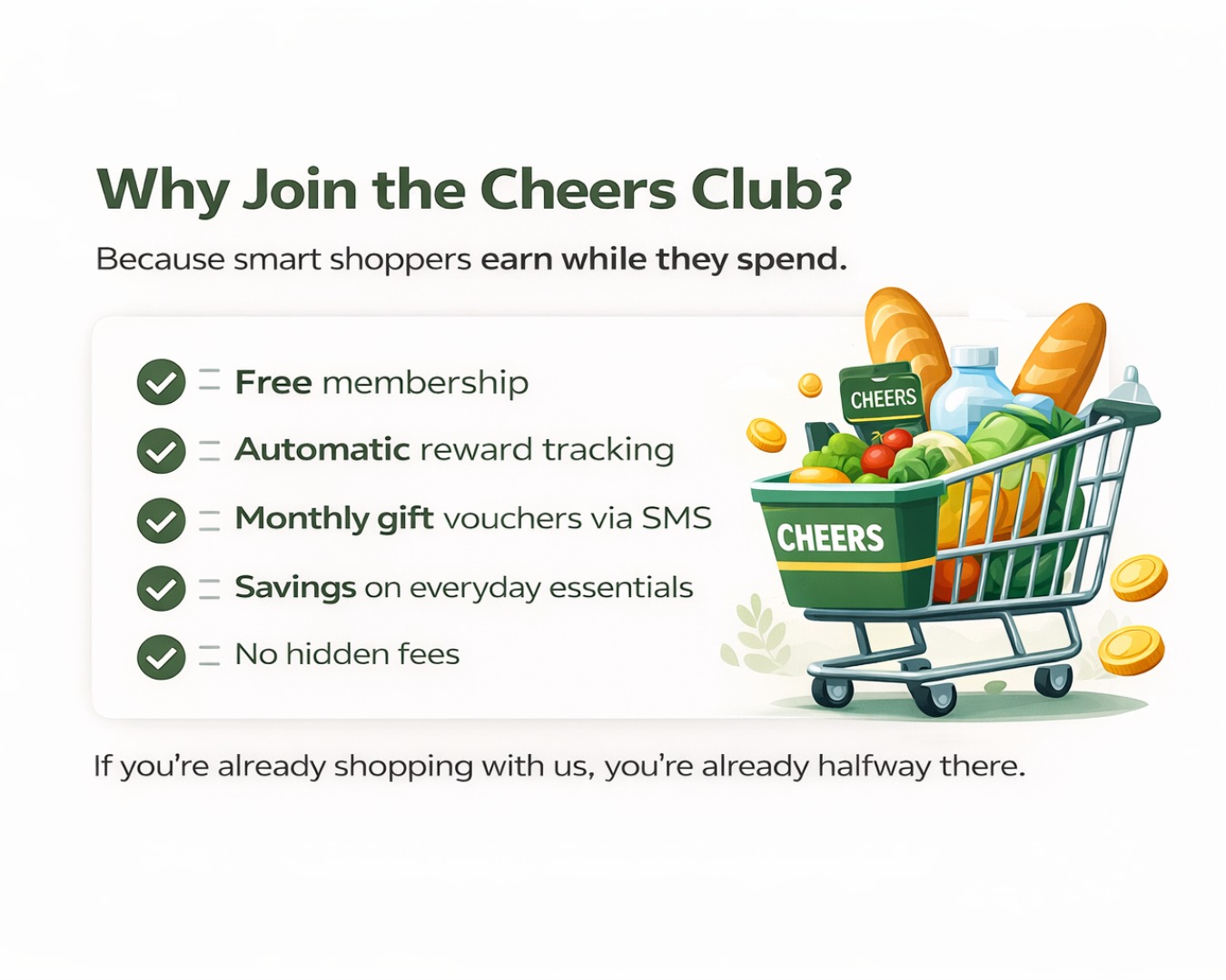 The Cheers Club is our free loyalty program designed to turn your everyday shopping into real monthly savings. Every eligible purchase brings you closer to gift vouchers — automatically.